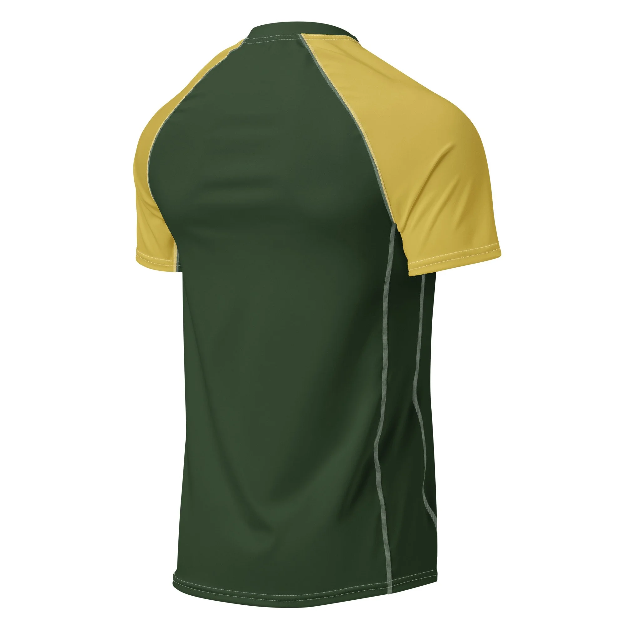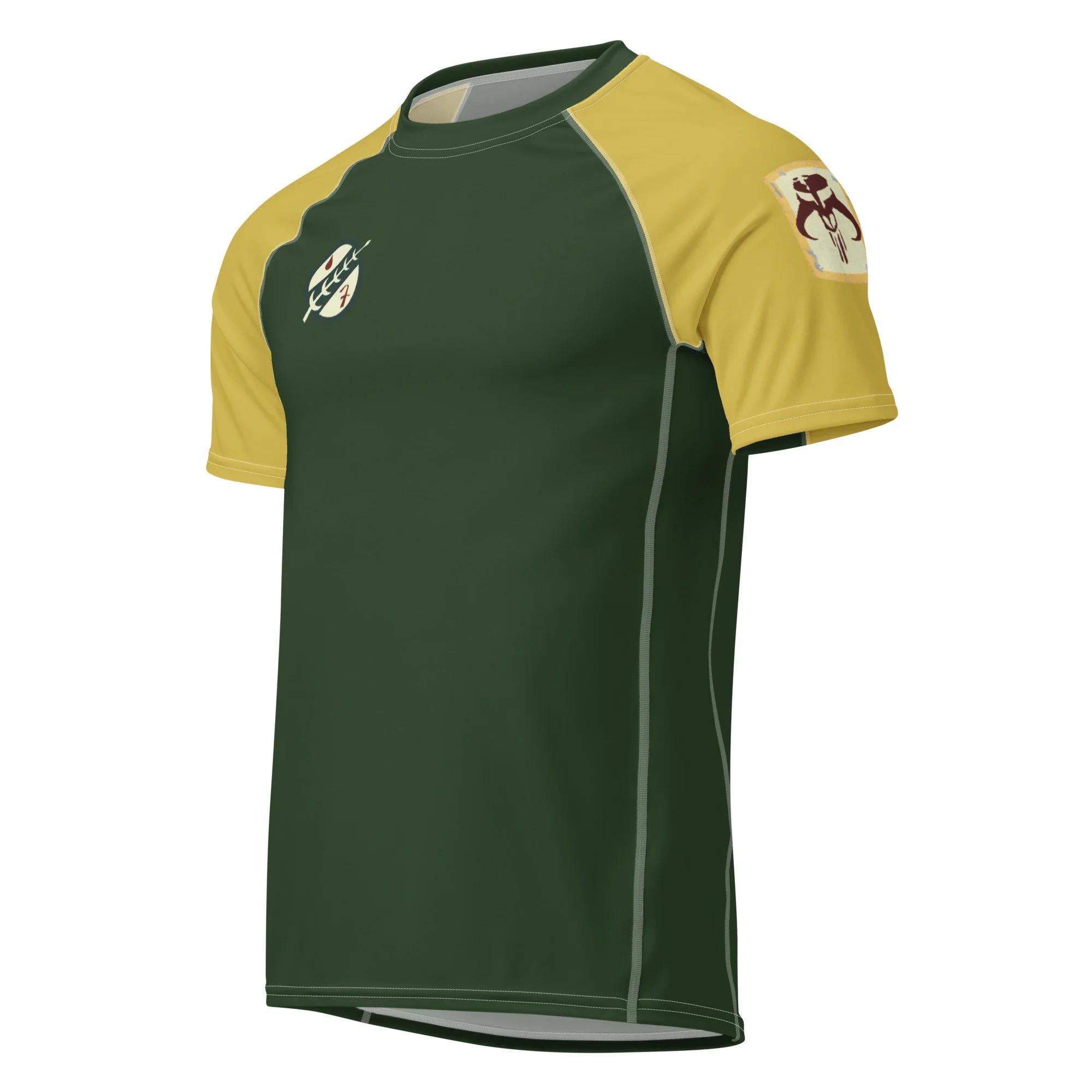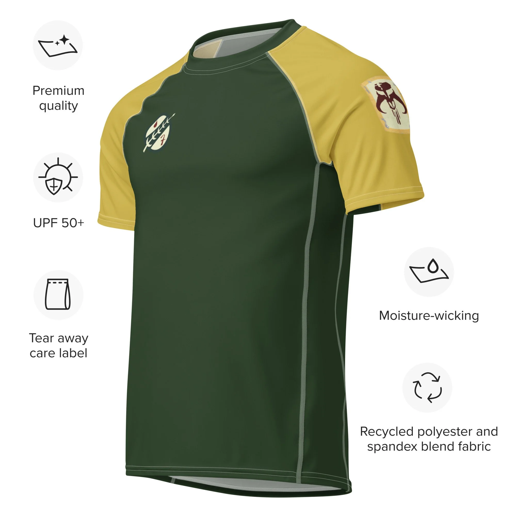 This rashguard is based off the Mandalorian beskar armor worn by the deadliest bounty hunter in the Galaxy. The sigil of Jaster Mereel is emblazoned on the right chest along with the iconic Mythosaur Skull on the left shoulder sleeve.